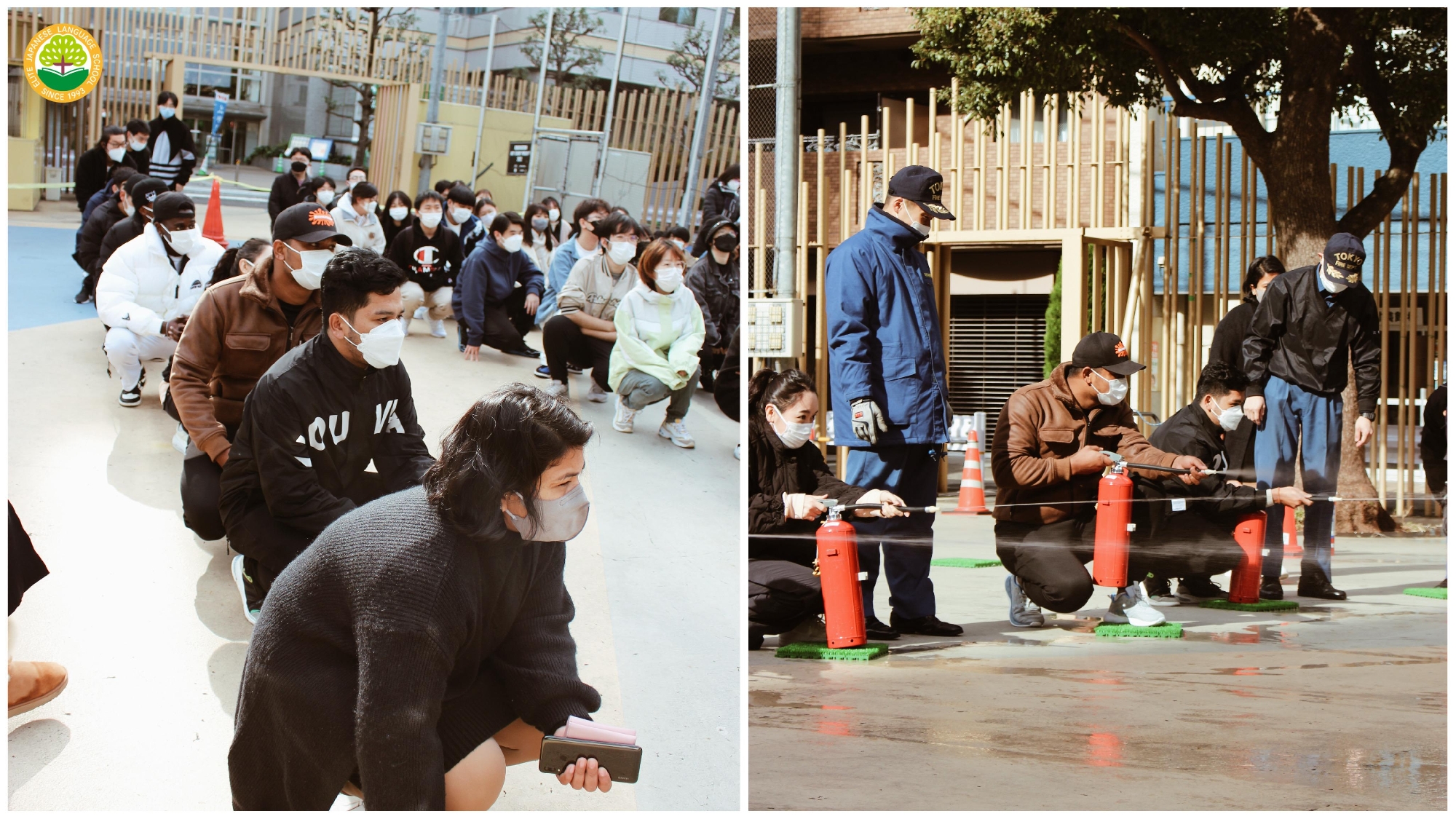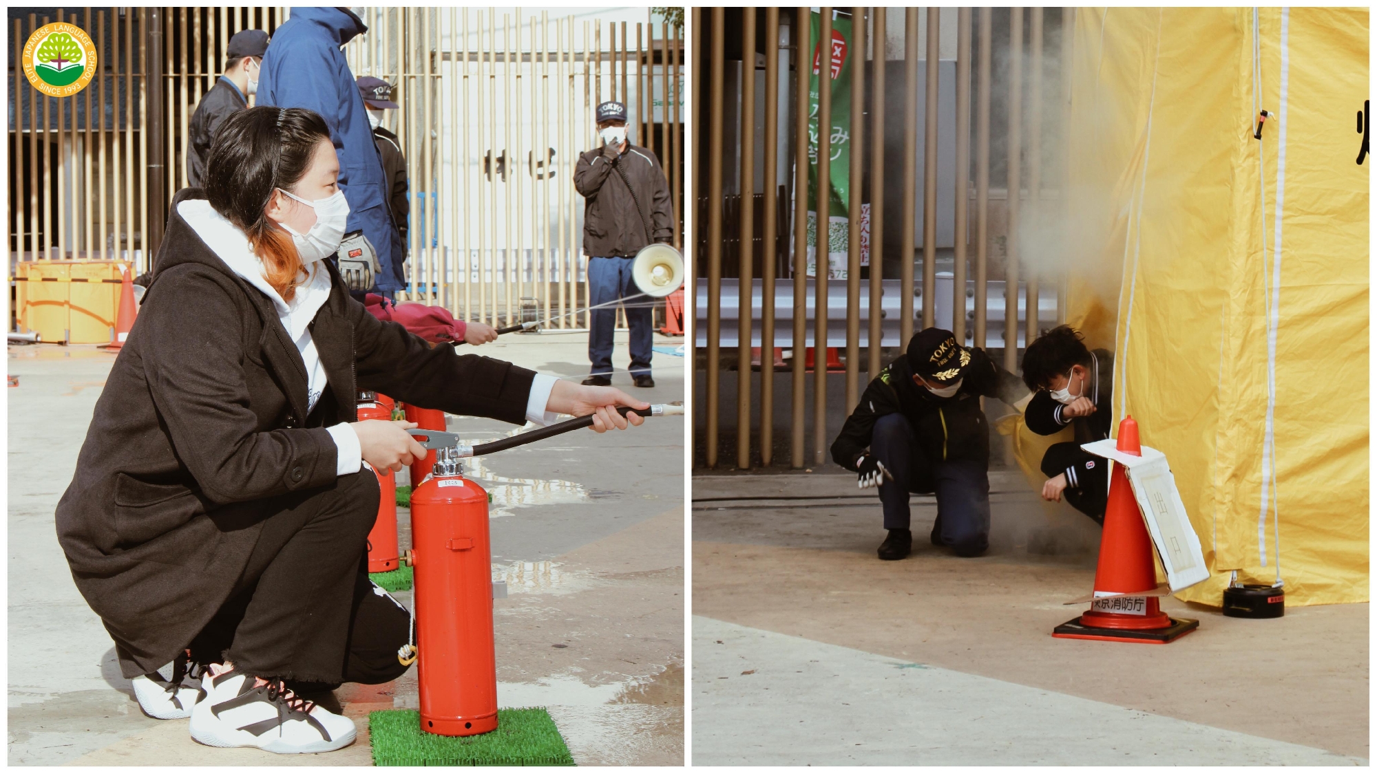 首先在教室听指导,接着去大久保公园避难,体验在烟雾中行走、使用灭火器、及7级地震体验。